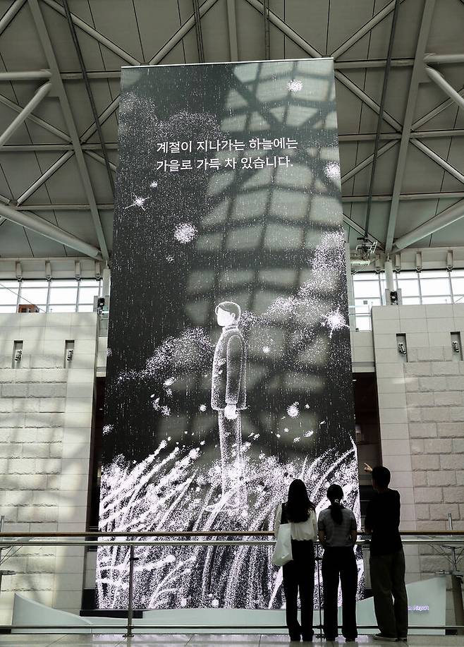 이번 전시에는 윤동주의 '별 헤는 밤'과 한강의 '흰'을 애니메이션화한 작품 2점으로 구성됐으며, 인천공항 제1·2여객터미널 출국장 주요 대형 전광판 9곳에서 상영됩니다.
