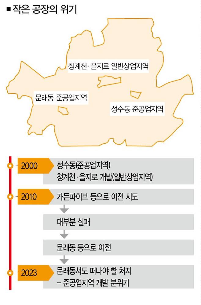 문제는 이런 '작은 공장'의 자리가 조금씩 줄어든다는 점이다. 작은 공장은 준공업지역이나 일반상업지역(폐수ㆍ대기유해물질 등을 배출하지 않거나 소음ㆍ진동이 일정 기준 이하인 경우)에도 둥지를 틀 수 있었다.