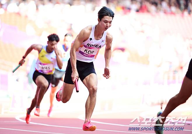 2일 중국 항저우 올림픽 스포츠센터에서 열린 항저우아시안게임 육상 남자 400m 계주 예선에 김국영, 이정태, 이재성, 박원진이 출전했다. 힘차게 스타트하고 있는 이정태. 항저우(중국)=송정헌 기자songs@sportschosun.com/2023.10.02/