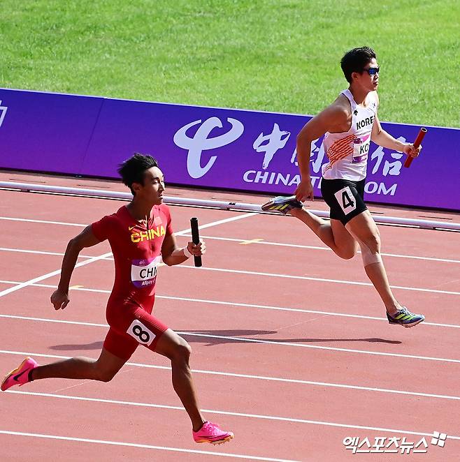 (엑스포츠뉴스 항저우(중국), 김한준 기자) 2일 오전 중국 항저우 올림픽 스포츠센터에서 열린 '2022 항저우 아시안게임' 육상 남자 400m 계주 예선 1조 예선, 대한민국이 38초75에 레이스를 마치며 결선 진출권을 손에 넣었다.