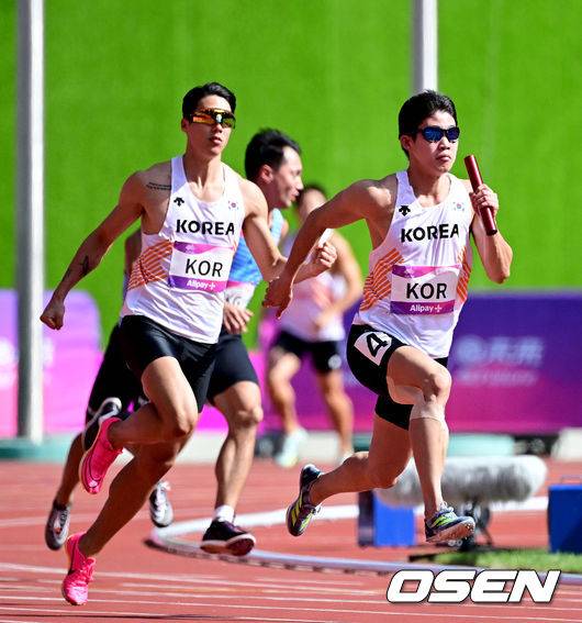 [OSEN=항저우(중국), 최규한 기자] 2일 오전 중국 항저우 올림픽 스포츠센터에서 ‘제19회 항저우 아시안게임’ 육상 남자 400m 계주 예선이 열렸다. 한국 이정태-김국영-이재성-박원진은 38초75의 기록으로 결선에 진출했다.