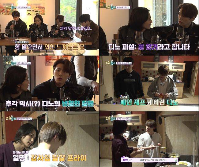 와인 장금이로 활약한 디노는 마트에서 장을 본 후 숙소에 돌아와 형들을 위한 야식 준비에 나서며 메인 셰프를 자처했다. 마지막으로 디노가 달걀프라이를 준비하자 정한이 도와주러 나섰다. “소금이 없다”는 디노의 말에 정한은 “감자칩을 부셔서 달걀프라이 위에 올리자”고 제안했다. 감자칩의 짭짤한 맛으로 소금을 대체하려는 생각이었던 것.