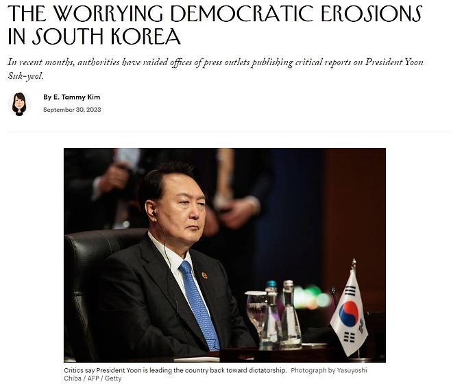 <더 뉴요커>는 9월 30일 '부식되어 가는 한국의 민주주의, 걱정된다(The Worrying Democratic Erosions in South Korea)'라는 제목의 기사를 통해 윤석열 정부의 언론사 압수수색과 야당 정치인과 노동계에 대한 검찰 수사를 언급했다.