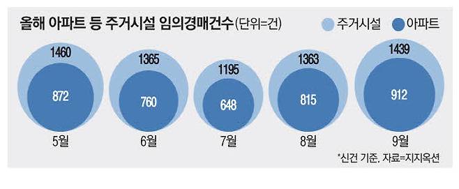 2일 경·공매 데이터 전문기업 지지옥션에 따르면 지난달 초부터 25일까지 임의경매를 통해 새롭게 진행된 주거시설 경매 건수는 1439건이고 이 가운데 아파트는 912건으로 나타났다. 주거시설 전체로 보면 8월보다 5.6%, 아파트는 11.9% 증가했다. 임의경매는 채무자가 빚을 제때 갚지 못할 경우 채권자가 담보권을 실행하기 위해 진행하는 경우다.
