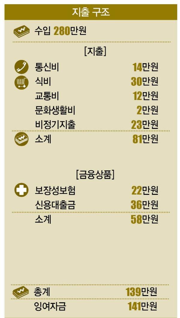 이렇게 총 지출은 139만원으로 잉여자금은 141만원이다. 매달 목돈의 잉여자금이 발생하는 황씨가 신용대출까지 받아야 했던 이유는 언급했듯 부모님 병원비ㆍ가족 생활비 등 불규칙한 지출이 많았기 때문이다. 더구나 잉여자금 141만원은 황씨 스스로 어디에 썼는지도 파악하지 못한 채 사라지고 없었다.