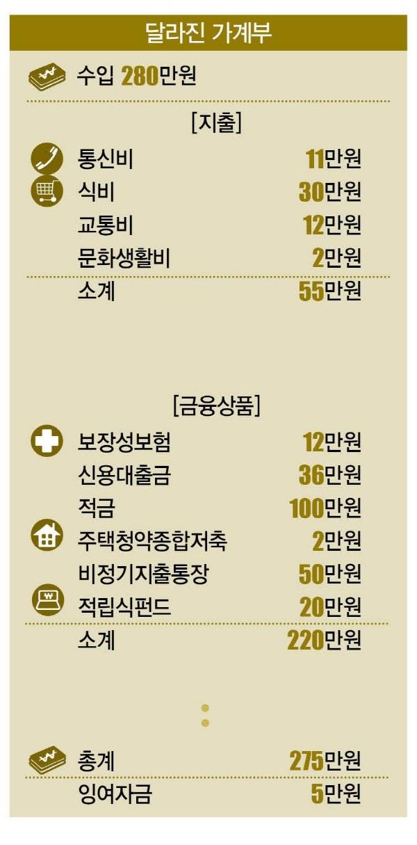 황씨의 월급은 280만원이다. 소비성지출은 통신비 14만원, 식비 30만원, 교통비 12만원, 문화생활비 2만원 등 58만원이었다. 여기에 부모님 용돈ㆍ경조사비ㆍ교육비ㆍ쇼핑비ㆍ휴가비 등으로 사용하는 비정기지출이 연간 275만원이었다. 월평균 비정기지출이 23만원으로 소비성지출은 총 81만원이었다.