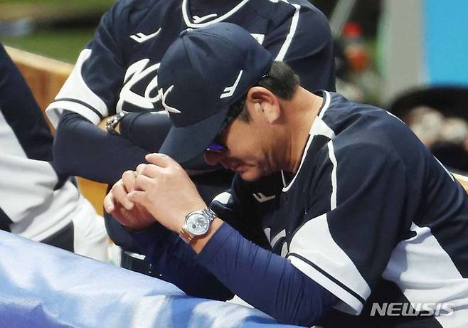 [사오싱=뉴시스] 조수정 기자 = 2일 중국 저장성 사오싱 1야구장에서 열린 2022 항저우 아시안게임 야구 B조 조별리그 2차전 대한민국 대 대만 경기, 9회 한국 류중일 감독이 고개를 숙이고 있다. 한국은 대만에 0-4로 패배했다. 2023.10.02. chocrystal@newsis.com