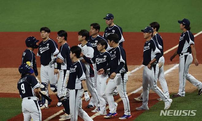 [사오싱=뉴시스] 조수정 기자 = 2일 중국 저장성 사오싱 1야구장에서 열린 2022 항저우 아시안게임 야구 B조 조별리그 2차전 대한민국 대 대만 경기, 0-4로 패배한 한국 선수들이 아쉬워하고 있다. 2023.10.02. chocrystal@newsis.com