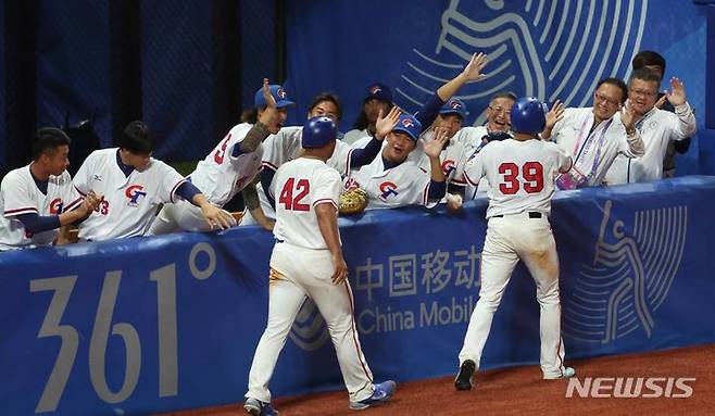 [사오싱=뉴시스] 조수정 기자 = 2일 중국 저장성 사오싱 1야구장에서 열린 2022 항저우 아시안게임 야구 B조 조별리그 2차전 대한민국 대 대만 경기, 8회말 2득점한 대만 선수들이 환호하고 있다. 2023.10.02. chocrystal@newsis.com