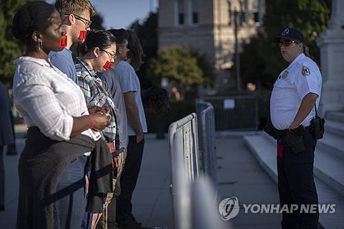 A police officer watches as members of the anti-abortion group "Bound4LIFE", wearing strips of red tape with the word "LIFE" over their lips, stand in front of the Supreme Court on the opening day of its new term, Monday, Oct. 2, 2023, in Washington. (AP Photo/Mark Schiefelbein)