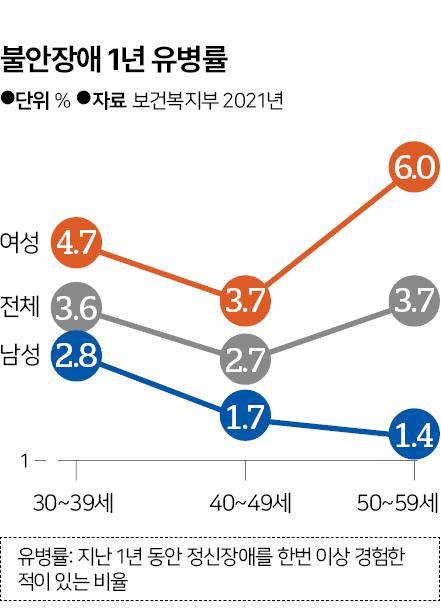 5년마다 시행되는 정신건강실태조사 최신 자료(보건복지부, 2021)를 살펴보면, 우리나라 성인의 정신장애 1년 유병률(지난 1년 동안 정신장애를 한번 이상 경험한 적이 있는 비율)은 남성 9.7%, 여성 8.4%로 남성이 여성보다 다소 높게 나타났다. 그러나 알코올과 니코틴 등 물질 관련 장애를 제외하면, 남성의 우울장애와 불안장애 유병률은 각각 1.1%와 1.6%인 데 반해 여성은 2.4%와 4.7%로 전반적으로 여성이 남성보다 우울장애는 2.2배, 불안장애는 2.9배 더 많이 경험하고 있다. 중년기를 중심으로 살펴보면, 우울장애 유병률은 30대 1.5%, 40대 1.5%, 50대 1.8%이며, 불안장애의 유병률은 30대 3.6%, 40대 2.7%, 50대 3.7%로 나타났다.