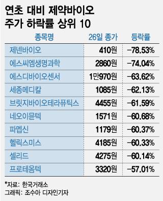 [바이오株 하락 상위10]'의견 거절+이자 연체' 제넨바이오, 78.5% ↓