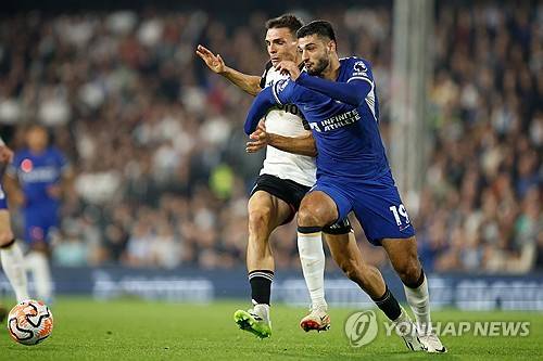epa10896458 Armando Broja of Chelsea (R) and Joao Palhinha of Fulham in action during the English Premier League soccer match between Fulham FC and Chelsea FC in London, Britain, 02 October 2023. EPA/DAVID CLIFF EDITORIAL USE ONLY. No use with unauthorized audio, video, data, fixture lists, club/league logos or 'live' services. Online in-match use limited to 120 images, no video emulation. No use in betting, games or single club/league/player publications.
