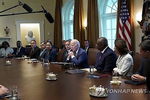 President Joe Biden speaks during a meeting with his Cabinet in the Cabinet Room of the White House in Washington, Monday, Oct. 2, 2023. From left, U.S. Ambassador to the United Nations Linda Thomas-Greenfield, Environmental Protection Agency Administrator Michael Regan, Education Secretary Miguel Cardona, Health and Human Services Secretary Xavier Becerra, Interior Secretary Deb Haaland, Secretary of State Antony Blinken, Biden, Defense Secretary Lloyd Austin, Commerce Secretary Gina Raimondo and Transportation Secretary Pete Buttigieg. (AP Photo/Susan Walsh)