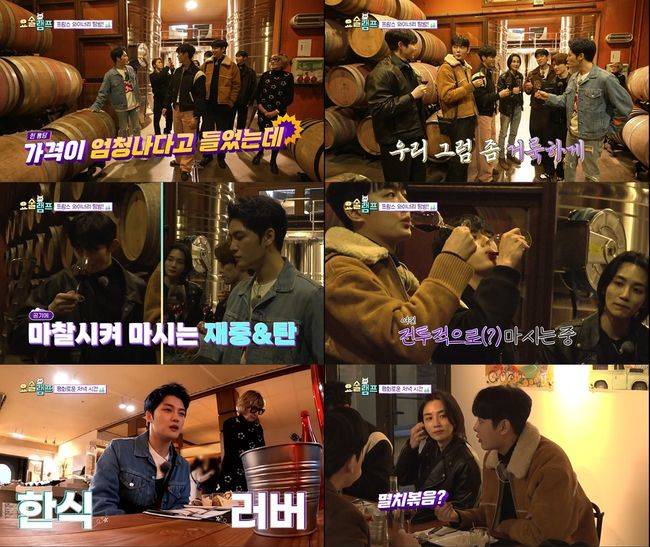 저마다 와인의 맛을 느끼며 음미하는 사이, 김재중은 "한국에서는 프랑스식으로 건배를 '드숑~', '마숑~'이라고 한다"며 농담을 건넸다. 맏형의 예상치 못한 애드리브에 동생들 사이에는 어색한 분위기가 감돌았고, 김재중은 부끄러움을 감추지 못했다. 결국 김재중의 애드리브로 건배사까지 하며 분위기가 한층 유쾌해졌다.