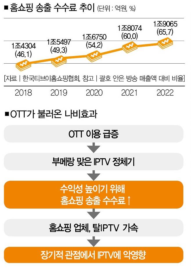 여기까지가 국내 IPTV 시장의 현주소입니다. OTT가 한국 소비 시장에 깊숙이 침투하면서 IPTV의 입지는 갈수록 좁아지고 있습니다. 수익을 도모하기 위해 홈쇼핑 업체들의 송출 수수료를 높인 탓에 홈쇼핑 업체들 사이에선 '탈IPTV' 움직임이 활발해지고 있습니다. 장기적인 관점에선 IPTV가 '악수'를 뒀다는 분석이 나오는 이유입니다.