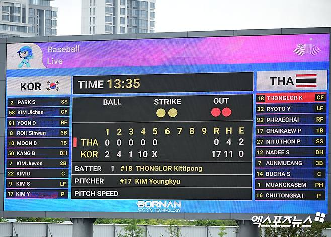 (엑스포츠뉴스 항저우(중국), 김한준 기자) 3일 오후 중국 항저우 사오싱 야구 스포츠 문화센터(Shaoxing Baseball & Softball Sports Centre-Baseball)에서 열린 '2022 항저우 아시안게임' 야구 조별리그 B조 3차전 대한민국과 태국의 경기, 대한민국이 11안타를 몰아치며 태국에 17:0 5회 콜드게임 승을 거뒀다.