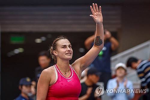 epa10896626 Aryna Sabalenka of Belarus celebrates after winning her match against Katie Boulter of Britain in the China Open tennis tournament in Beijing, China, 03 October 2023. EPA/MARK R. CRISTINO