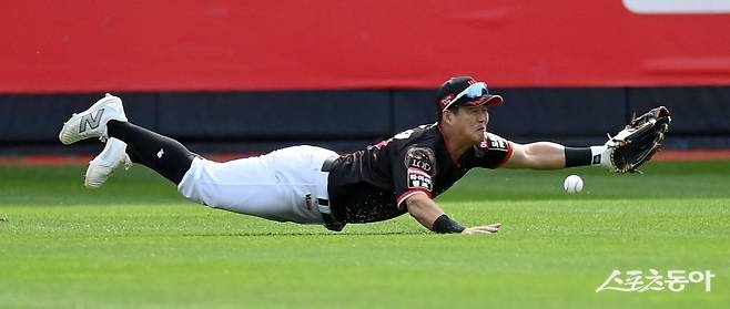 3일 수원 KT위즈파크에서 ‘2023 신한은행 SOL KBO리그’ KIA 타이거즈와 KT 위즈 경기가 열렸다. 1회초 무사 KT 배정대가 다이빙캐치를 시도했으나 놓치고 있다.