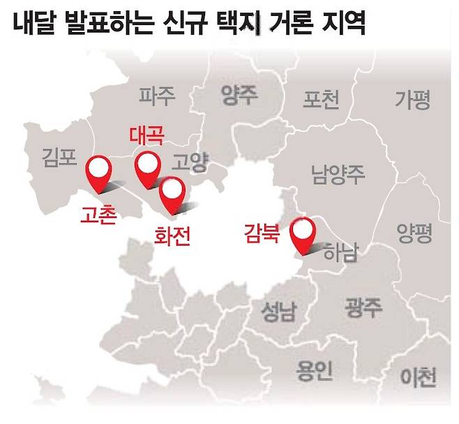 이 때문에 업계에선 고양 대곡·화전, 김포 고촌, 하남 감북을 유력 후보지로 꼽고 있다. 공통적으로 서울 접근성이 뛰어나 신규 택지 선정 때마다 1순위에 오른 데다 GTX 개통 예정 지역들이다.