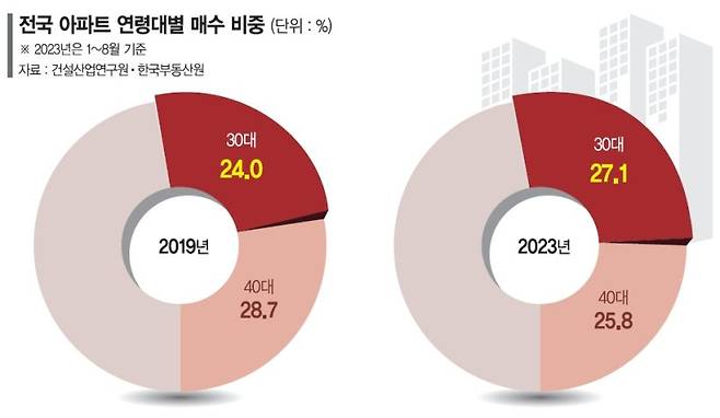 아파트 연령대별 매입자 집계를 시작한 2019년이후 전국 아파트 매매시장에서 30대 비중이 40대를 추월한 것은 올해가 처음이다.