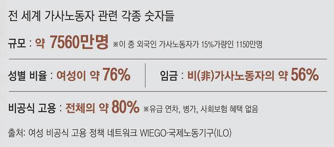 세계는 가사노동자를 내보내고 받아들이는 망으로 연결돼 있다. 국제가사노동자연맹에 따르면, 2022년 기준 각 가정에 고용돼 돌봄·청소·운전·경비 등을 하는 15세 이상 가사노동자는 전 세계 약 7560만명이다. 이 중 76%는 여성이다. 전 세계적으로 가사노동자는 여성 고용의 4%, 남성 고용의 1%가량을 차지한다.