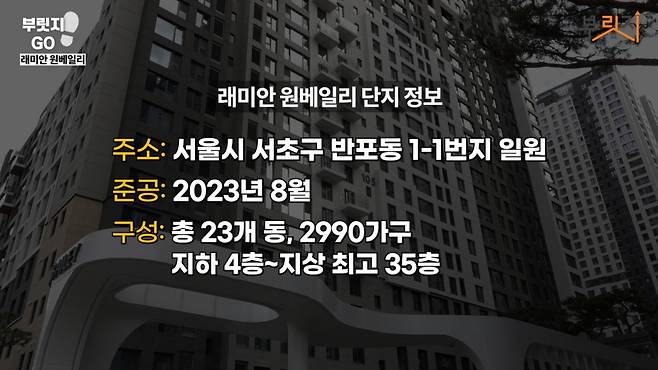 래미안 원베일리는 서울 서초구 반포동 1-1번지 일원, 신반포아파트 3차와 반포 경남아파트 등을 재건축한 단지입니다. 지하 4층에서 지상 최고 35층. 23개동, 총 2990(이천구백아흔)가구의 대단지이며, 224가구가 일반에 분양됐죠.