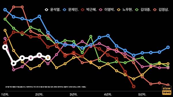 - 역대 대통령 지지율을 살펴보면 윤석열(대통령)은 2년 차 1분기 기준으로 이명박(전 대통령)보다는 높지만 노무현(전 대통령)과 비슷한 수준이다. 애초에 출범 초기부터 가장 낮은 지지율로 시작했고 콘크리트 지지층도 가장 얇다는 평가를 받아왔다. 8월22일 기준 갤럽 조사에서 윤석열 지지율은 34%였다.