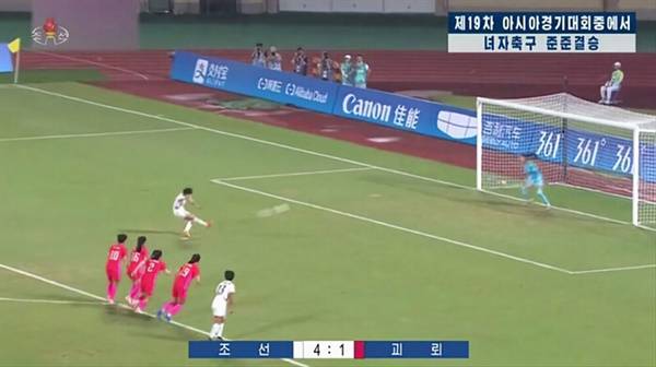- 북한이 아시안 게임 여자 축구 경기를 중계하면서 내보낸 자막이다. '북조선'과 '남조선'에서 위상이 달라졌다.