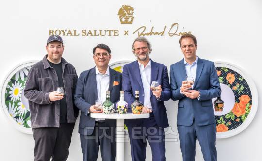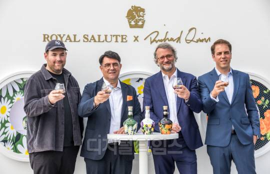 4일 서울 종로구 누디트 익선에서 참석자들이 전세계에서 최초 공개되는 '로얄살루트 21년 리차드 퀸 에디션2'를 선보이고 있다. 왼쪽부터 리차드 퀸 패션 디자이너, 프란츠 호튼 페르노리카코리아 CEO, 마티유 들랑 글로벌 마케팅 디렉터, 미구엘 파스칼 마케팅 전무.