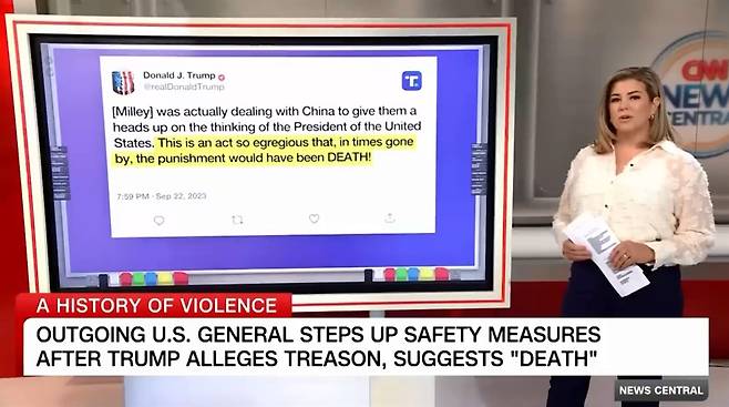 | ▲ 트럼프 전 대통령이 자신의 SNS에서 퇴임하는 밀리 의장을 공개 경고한 것을 두고 문제점을 보도한 CNN 뉴스 장면. |