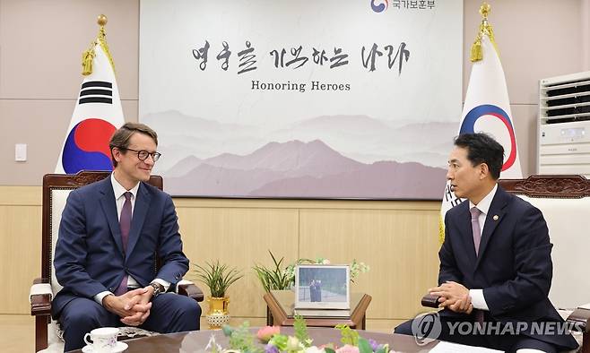 (서울=연합뉴스) 박민식 국가보훈부 장관이 4일 서울시 용산구 국가보훈부 서울지방보훈청에서 필립 베르투 주한 프랑스 대사 내정자를 만나 환담을 하고 있다. 2023.10.4 [국가보훈부 제공. 재판매 및 DB 금지]