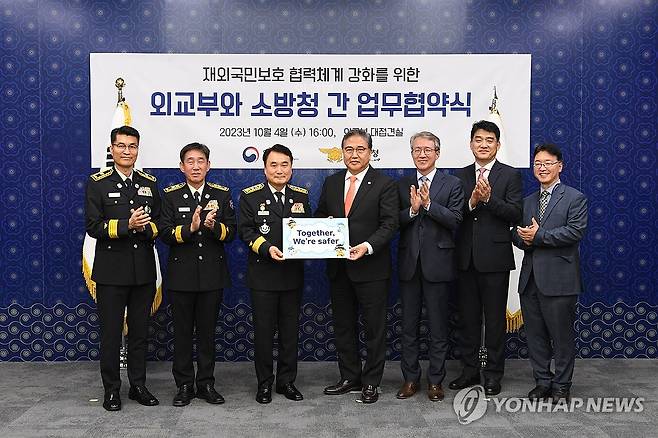 (서울=연합뉴스) 4일 서울 종로구 외교부에서 열린 '재외국민보호 협력 체계 강화를 위한 업무협약식'에서 박진 외교부 장관과 남화영 소방청장이 협약 체결 후 기념 촬영하고 있다. 2023.10.4 [소방청 제공. 재판매 및 DB 금지]