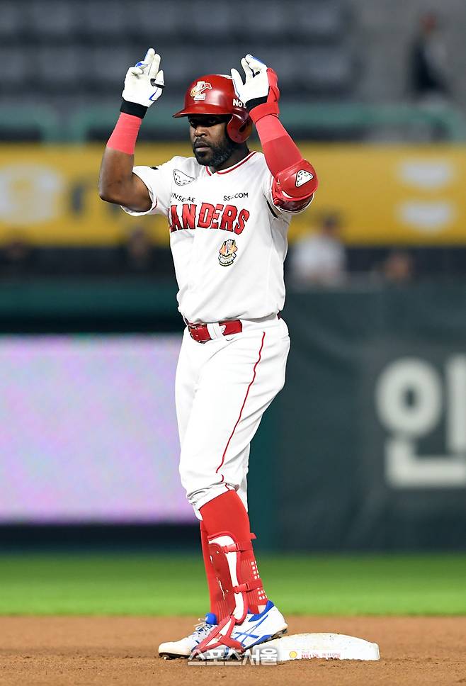 SSG 랜더스 에레디아가 4일 인천 SSG랜더스필드에서 열린 NC 다이노스와 경기 4회말 2사 2루 상황에서 NC 선발 최성영을 상대로 동점 1타점 2루타를 치고 세리머니를 하고 있다. 2023. 10. 4. 문학 | 박진업기자 upandup@sportsseoul.com