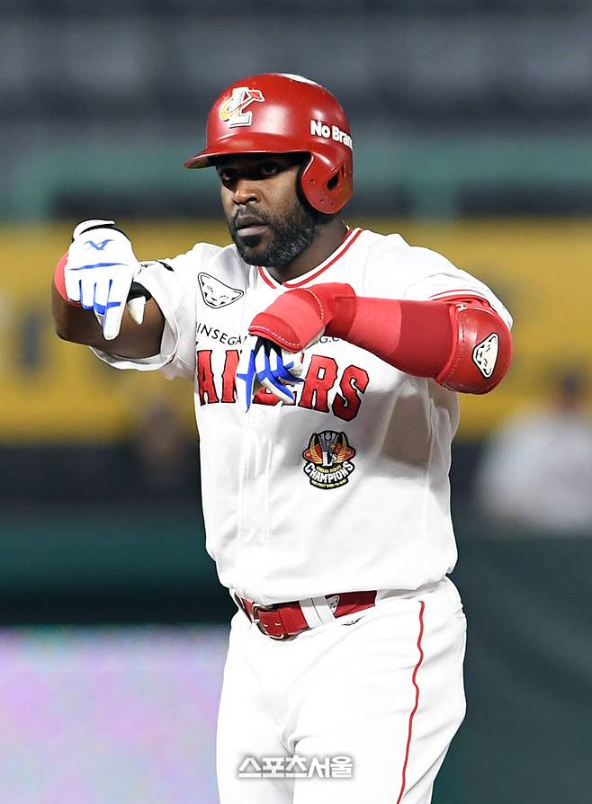 SSG 랜더스 에레디아가 4일 인천 SSG랜더스필드에서 열린 NC 다이노스와 경기 4회말 2사 2루 상황에서 NC 선발 최성영을 상대로 동점 1타점 2루타를 치고 세리머니를 하고 있다. 2023. 10. 4. 문학 | 박진업기자 upandup@sportsseoul.com