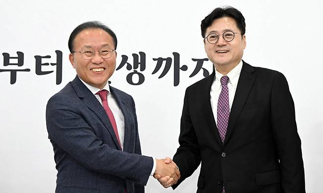국민의힘 윤재옥 원내대표(왼쪽)가 4일 서울 여의도 국회에서 더불어민주당 홍익표 신임 원내대표의 예방을 받고 악수를 하고 있다. 이 자리에서 양당 원내대표는 김행 여성가족부 장관 후보자 인사청문회가 개최될 수 있도록 여야 여성가족위원회 간사들이 협의하도록 조치하는 데 뜻을 모았다.