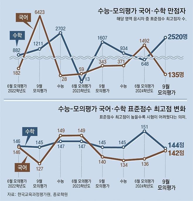 반면 국어는 어렵게 출제돼 변별력이 확보됐다. 국어 영역의 표준점수 최고점은 142점으로 지난해 수능(134점)과 올 6월 모의평가(136점)에 비해 올랐다. 만점자 비율도 전체 응시자의 0.04%로 6월(0.39%)에 비해 대폭 감소했다. 윤석열 대통령이 직접 지목했던 비문학의 킬러 문항이 빠진 대신 문학에서 선택지가 까다로운 문항이 다수 출제되면서 난도가 높아진 것으로 분석된다.