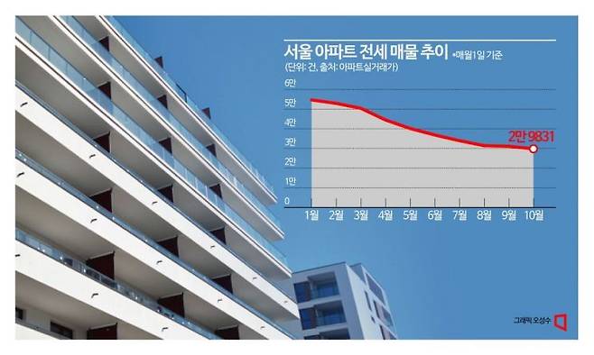 가을 이사철이 다가왔지만, 서울 아파트 전세 매물이 메마르고 있다. 전세사기·고금리 여파로 올해 초만 해도 5만건 대에 이르던 매물이 10월 들어 2만건 대로 추락했다. 내년 서울 입주 물량도 올해의 반토막이라 당장 서울 전셋값 안정화에 '적신호'가 켜졌다.