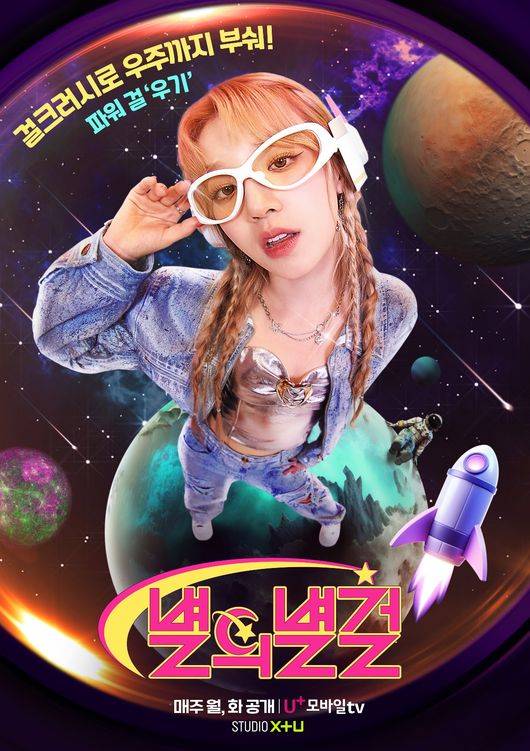 이번에 공개된 포스터는 우주 행성과 우주선, 광활한 은하계를 표현하는 다채로운 배경 위에 전세계 최초로 우주 시장에 도전하는 걸그룹 멤버 츄, 우기, 츠키 각자의 '탈 지구급' 매력이 더해져 눈길을 사로잡는다.