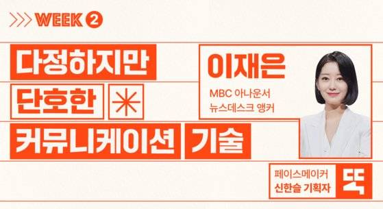 두 번째 주에는 MBC 뉴스데스크의 간판, 이재은 아나운서에게 타인의 마음과 내 마음을 지키는 말하기 기술을 전수 받습니다. '다정한 말이 똑똑한 말을 이깁니다'라는 책을 쓰기도 한 이재은 아나운서가 10년 차 방송인의 경력을 살려 말과 마음에 대한 인사이트를 공유할 예정입니다.