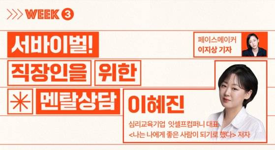 세 번째 주는 직장인을 위한 슬기로운 멘탈 관리 시간입니다. 삼성그룹, 롯데그룹, SK하이닉스 등 수많은 기업의 직장인, 임원, 대표를 상대로 마음 관리와 역량 개발을 상담하고 코칭해 온 베테랑 심리상담 전문가 이혜진 작가를 모셨습니다. 내 감정을 잘 살펴가며 현명하게 일하는 구체적인 방법을 알려 줄 예정입니다.