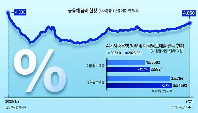 ▶‘DSR 예외’ 예담대 잔액 급증에도 청약담보대출은 ‘찔끔’ 상승=5일 금융권에 따르면 4대 시중은행(KB국민·신한·하나·우리)의 예금담보대출(청약통장 제외) 잔액은 8월 말 기준 2조921억원으로 지난 1월 말(1조8582억원)과 비교해 약 2339억원(12.6%) 늘어난 것으로 나타났다. 고금리가 이어지는 상황에서 보유한 예금 이자율에 1% 안팎의 가산금리만 부담하면 대출이 가능한 예담대의 매력이 부각된 영향이다. 게다가 예담대는 총부채원리상환비율(DSR) 적용에서도 예외라는 장점이 있다.