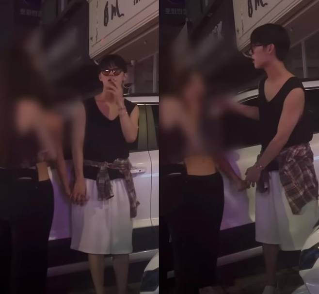 여성을 끌어안으려는 모습을 보이며 다정한 모습을 보이더니 자연스럽게 담배 꽁초를 차량 옆 길바닥에 던져 눈살을 찌푸리게 했다.