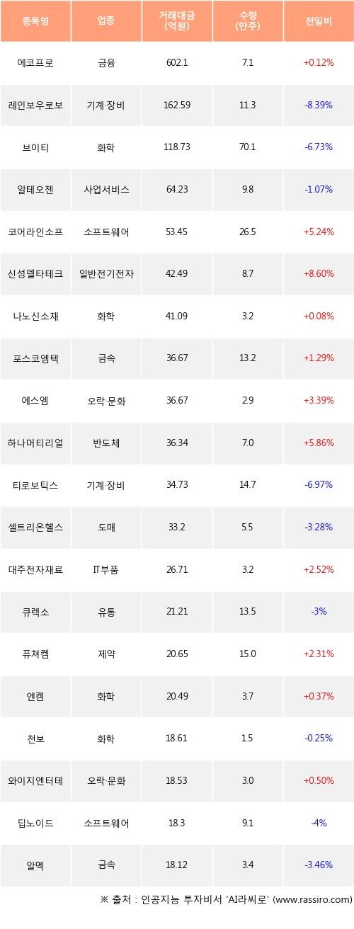 에코프로, 코어라인소프트, 신성델타테크 등은 전일 대비 주가가 상승했고, 레인보우로보틱스, 브이티, 알테오젠 등은 주가가 하락했다.