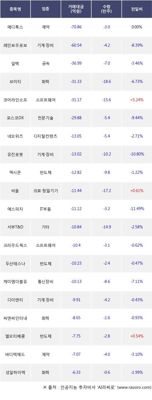 기관 투자자의 순매도 상위 20개 종목은 메디톡스, 레인보우로보틱스, 알멕, 브이티, 코어라인소프트, 포스코DX, 네오위즈, 유진로봇, 엑시콘, 비올등이다.