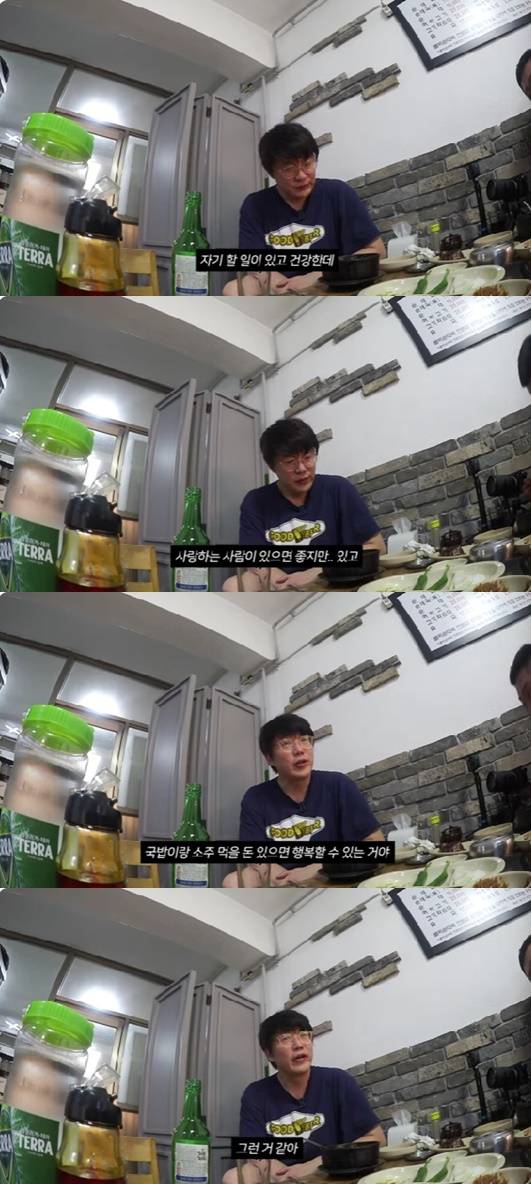 그런가 하면 성시경은 순댓국을 맛있게 먹더니 "자기 할 일이 있고 건강한데 사랑하는 사람이 있으면 좋지만 있고 국밥과 소주 먹을 돈이 있으면 행복할 수 있는 거다"라며 담담하게 이야기했다.