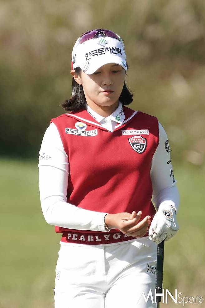 (MHN스포츠 여주, 박태성 기자) 5일 경기 여주에 위치한 블루헤런 골프클럽(파72ㅣ6,763야드)에서 '제23회 하이트진로 챔피언십'(총상금 12억 원, 우승상금 2억 1천 6백만 원) 1라운드가 열린가운데, 박현경이 2번홀 그린 퍼트 라인을 살피고 있다.
