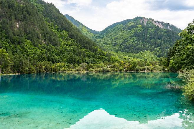 오화해를 보려면 측사와구에서 수정구 갈림길로 내려와 다시 '일측구(日則沟, 구채구의 계곡)'로 올라가야 한다. Y자 협곡의 불편함이다. 오화해는 해발 2,472m에 위치한 호수다. 무려 백두산에 버금가는 높이다. 오화해는 구채구의 영혼이라 불릴 정도로 아름답다. 청초록 수면도 특별하지만, 주변 산세가 호수에 반영되어 수면을 분리하는 기하학적 풍경이 더더욱 장관이다.