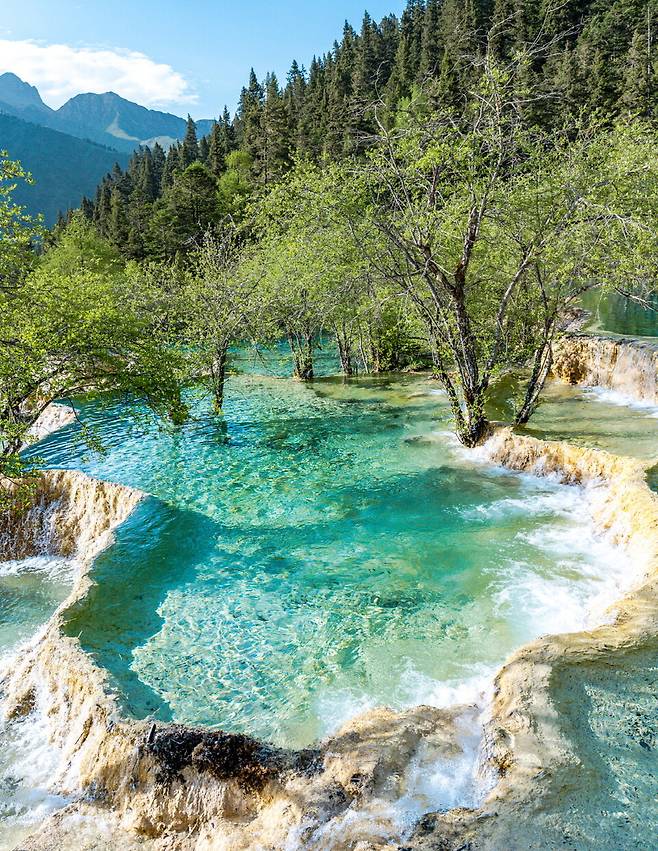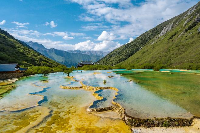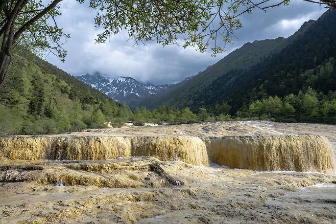 구채구의 오채지와 이름은 같지만 느낌은 확연히 다르다. 케이블카에서 내려 걷다가 전망대에서 황룡 오채지를 처음 봤을 때 사실 인공으로 만든 풀장쯤으로 여겼다. 자연이 만든 물색과 지형이라고는 도저히 믿을 수가 없었기 때문이다. 아래로 내려가 실감하고는 길고 큰 감탄을 쏟아 냈다. 하늘과 구름은 다랑논처럼 이어진 해발 3,533m, 693개의 연못에 고스란히 담겨 있었다. 더구나 눈 덮인 설보정(雪寶鼎, 해발 5,588m)을 배경으로 하고 있으니, 그야말로 상상만 했던 무협지 속 장면이었다.