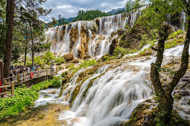 '오화해'를 탈출한 물은 황금빛 넓은 바위 계곡을 타고 흐른다. 그때 진주알(진주탄)처럼 기포가 발생하게 된다. 그 물이 모여 세력을 키우고, 결국 웅장하게 쏟아 내는 비경이 바로 '진주탄폭포'다. 구채구 최고 절경이다. 폭 200m에 달하는 대형폭포가 쏟아 내는 하얀 물줄기는 힘차고 우아하다. 그 모습을 본 어느 시인은 폭포의 움직임 하나하나가 섬세하며 깨끗하고, 그 어떤 드라마틱한 영상이나 사진보다 입체적이라고 표현했다.